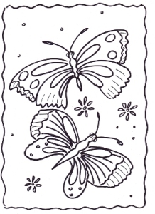 Print de tekening op een sheet of trek hem met een watervaste stift over op een sheet. Versier de vlinders met de gekleurde plakfolie of doorzichtige snoeppapiertjes.